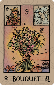 Summary: The Bouquet symbolizes beauty and kindness. It represents anything that brings joy, such as art, craftsmanship, gifts, and rewards. It also includes acts of kindness, such as praise, appreciation, and thoughtful gestures.