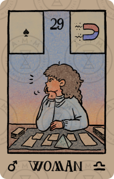 Note: - The interpretation of femininity (*) depends on the querent’s personal definition. - In some Lenormand variations, ♀ Venus and ♂ Mars symbols were used for gender representation. However, in the Akashic Eye Lenormand, Mars corresponds to the Woman card and Venus to the Man card due to their respective associations with experience, emotion, resilience, and self-transformation.