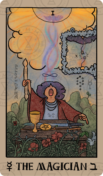 Card Imagery: The Magician stands before a table, holding a wand, preparing to draw power from above. His abilities are exceptional, and his energy is immense.