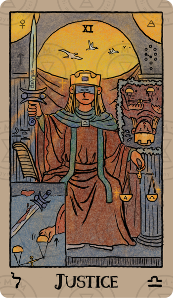Card Imagery: A blindfolded figure wearing a red robe sits between two pillars, holding a sword in one hand and scales in the other.