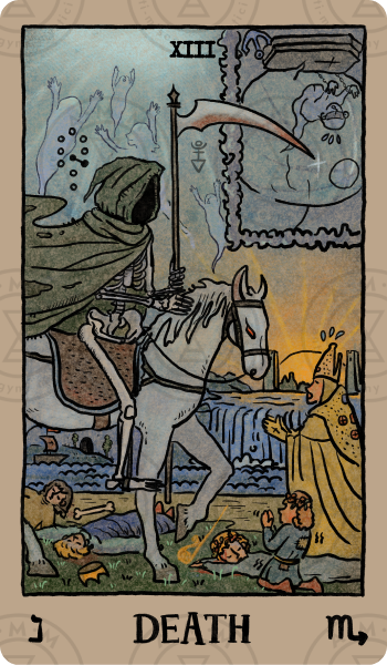 Card Imagery: Death rides a white horse, carrying out its mission. In the face of death, social class, race, and gender do not matter. However, behind Death, harvested souls are flying toward the light.