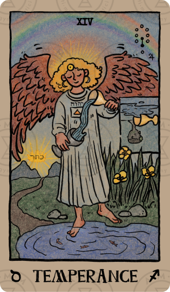 Card Imagery: An angel stands calmly by the water’s edge, one foot on the land and one in the pool. Holding two sacred chalices, he continuously pours water between them without spilling a single drop.