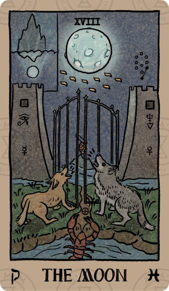 Card Imagery: A dog and a wolf howl at an eerie moon. In front of them, an iron gate separates them from the turbulent sea.