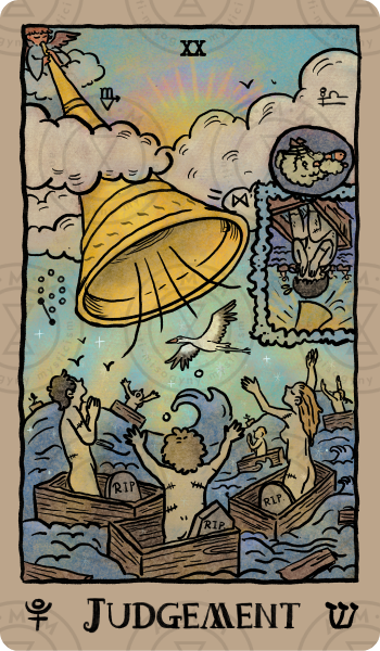 Card Imagery: An angel sounds a trumpet, awakening figures rising from their graves, arms outstretched in divine realization.