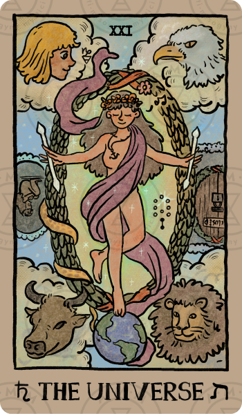 Card Imagery: A celestial dancer moves gracefully within a wreath, symbolizing eternal cycles and completion.