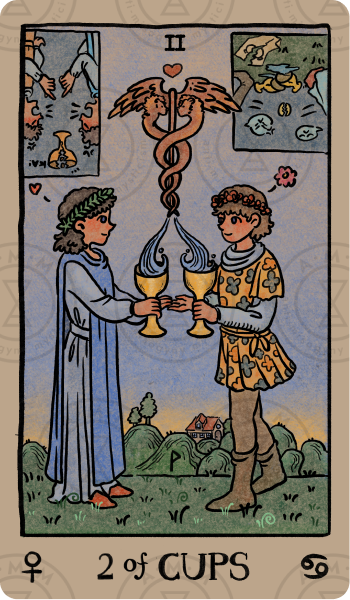 Card Imagery: Two figures exchange cups, symbolizing harmony.