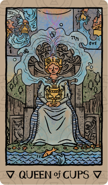 Card Imagery: The Queen of Cups sits on her throne by the sea, holding a cup. Water continuously flows from her head into the cup.