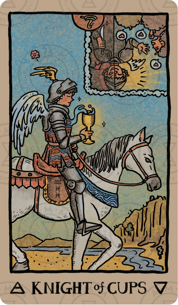 Card Imagery: The Knight of Cups elegantly rides a white horse forward, holding a cup high, while the water within him fills the cup.