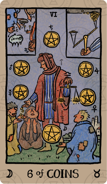 Card Imagery: A wealthy man holds a balance scale, evenly distributing coins to the poor kneeling before him.
