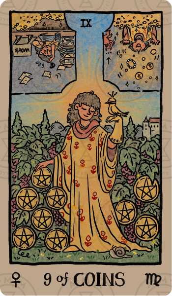 Card Imagery: A finely dressed woman stands in a bountiful vineyard, holding a bird in one hand while caressing a newly ripened coin with the other, looking completely at ease.