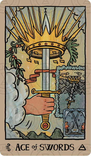 Card Imagery: A hand emerges from a cloud, grasping a sword that pierces through a crown.