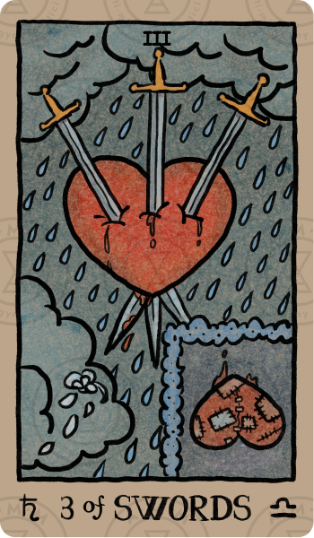 Card Imagery: Three swords pierce a heart under a stormy sky.