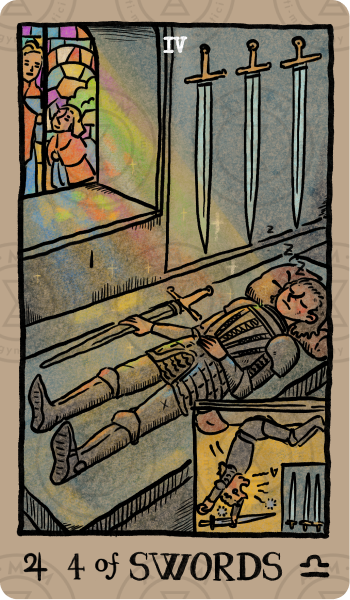 Card Imagery: A warrior rests in a church, one hand still gripping a sword.