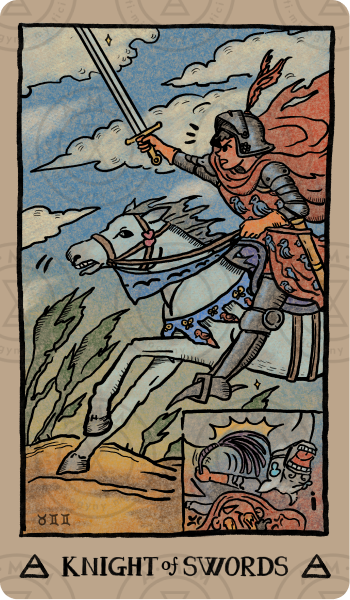 Card Imagery: The Knight of Swords' expression changes—his anger is taken out on his horse, his battle companion.