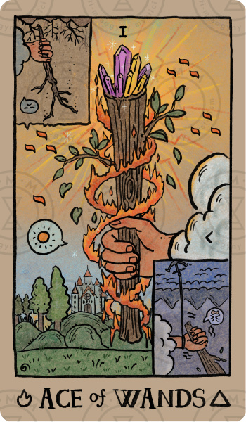 Card Imagery: A hand emerges from a cloud, holding a wand engulfed in flames.