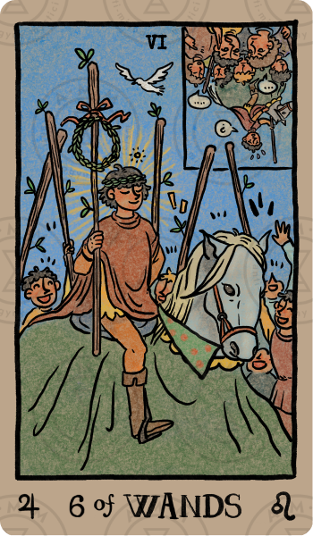 Card Imagery: A warrior on a white horse returns in triumph, surrounded by cheering people.