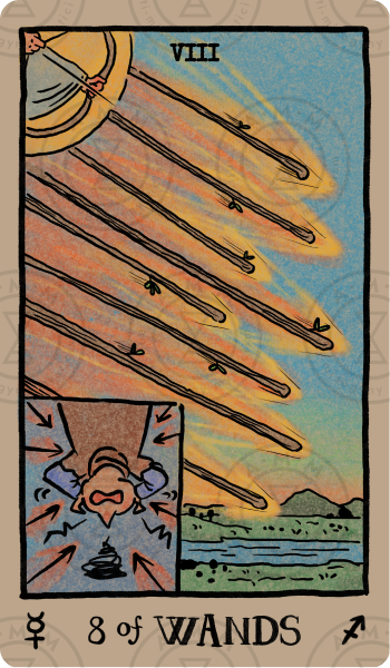 Card Imagery: Eight wands crash toward a figure, causing distress.