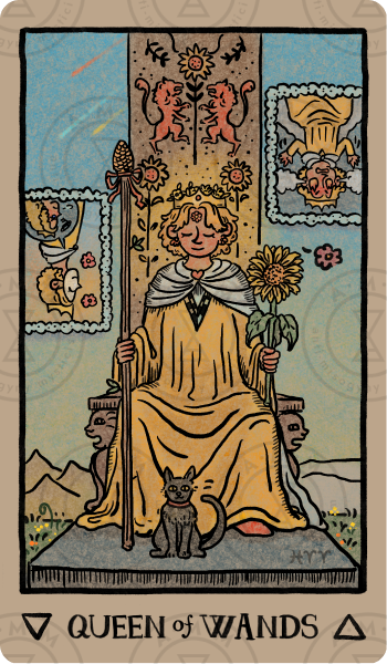 Card Imagery: The Queen of Wands sits on her throne, holding a staff in one hand and a sunflower in the other, smiling as she reflects.