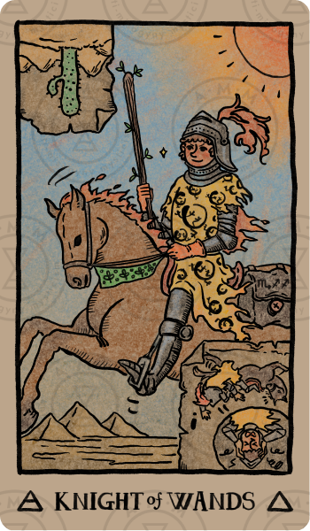 Card Imagery: The Knight of Wands rides his horse through the desert, holding a wand confidently while looking ahead.