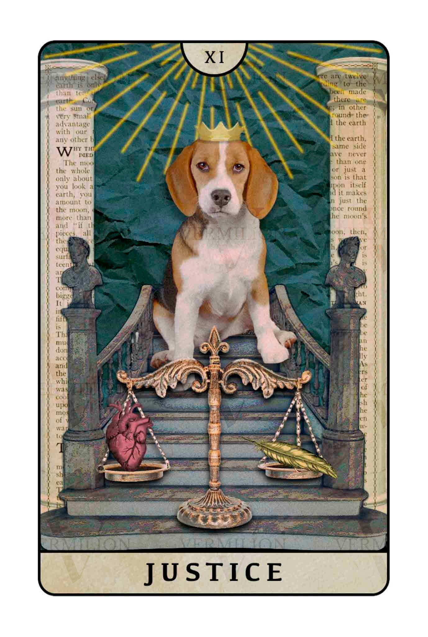 This time, the beagle has taken on the role of the messenger of justice. In front of it stands the scales, representing truth and fairness. When the Justice card appears upright, it signifies that fairness and justice will or should prevail. Drawing this card suggests that you may need to make an important decision, one that should be based on facts and logic, not emotion. The upright Justice card emphasizes honesty, fairness, and moral principles—whether in personal relationships, career choices, or legal matters.