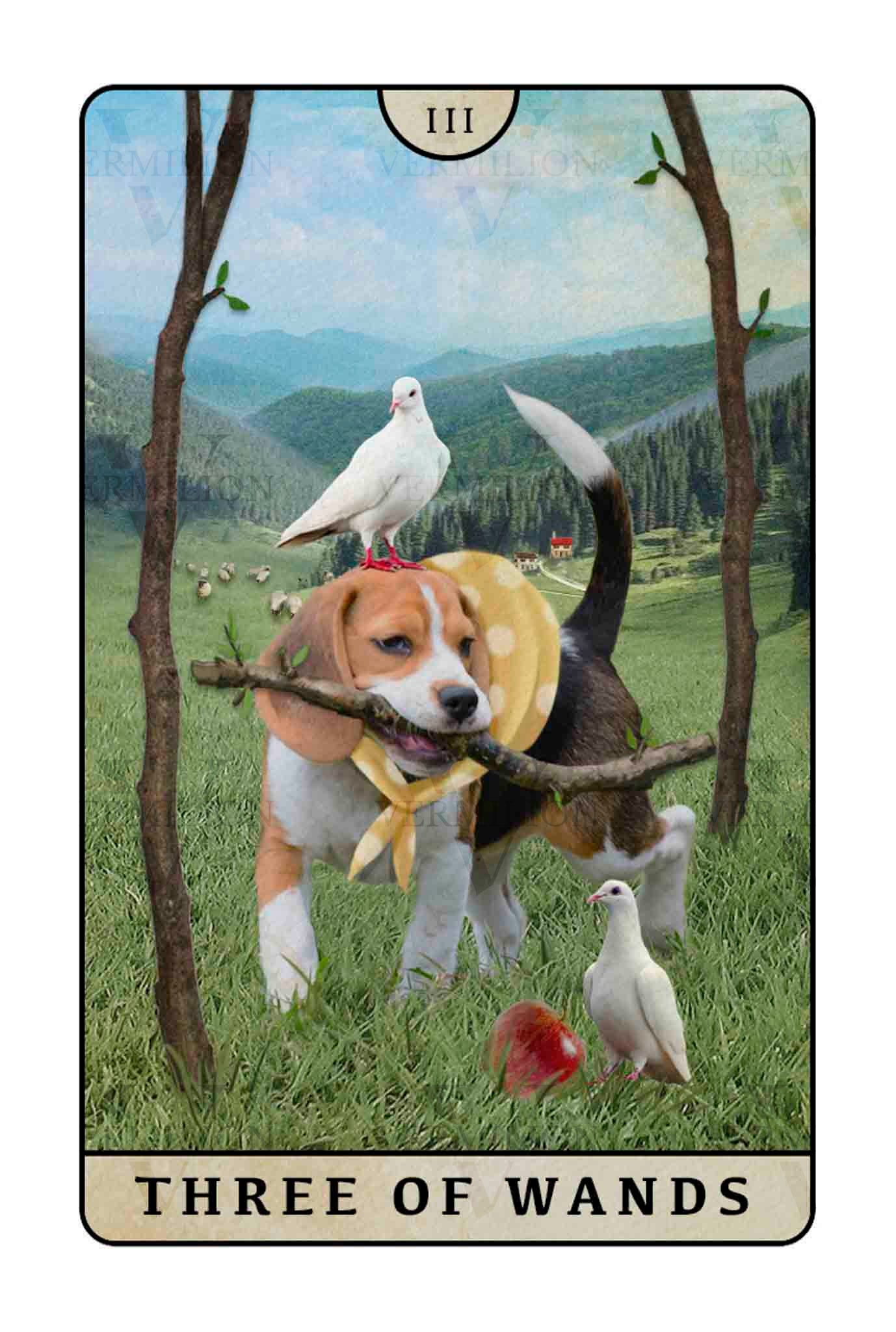 When the Three of Wands appears reversed, it may suggest that errors or obstacles have disrupted your plans, making the future seem less certain than expected. This could be due to inadequate preparation, overconfidence, or external setbacks. Perhaps someone important has yet to make a firm decision—so things may quickly return to the beagle’s normal routine for now.