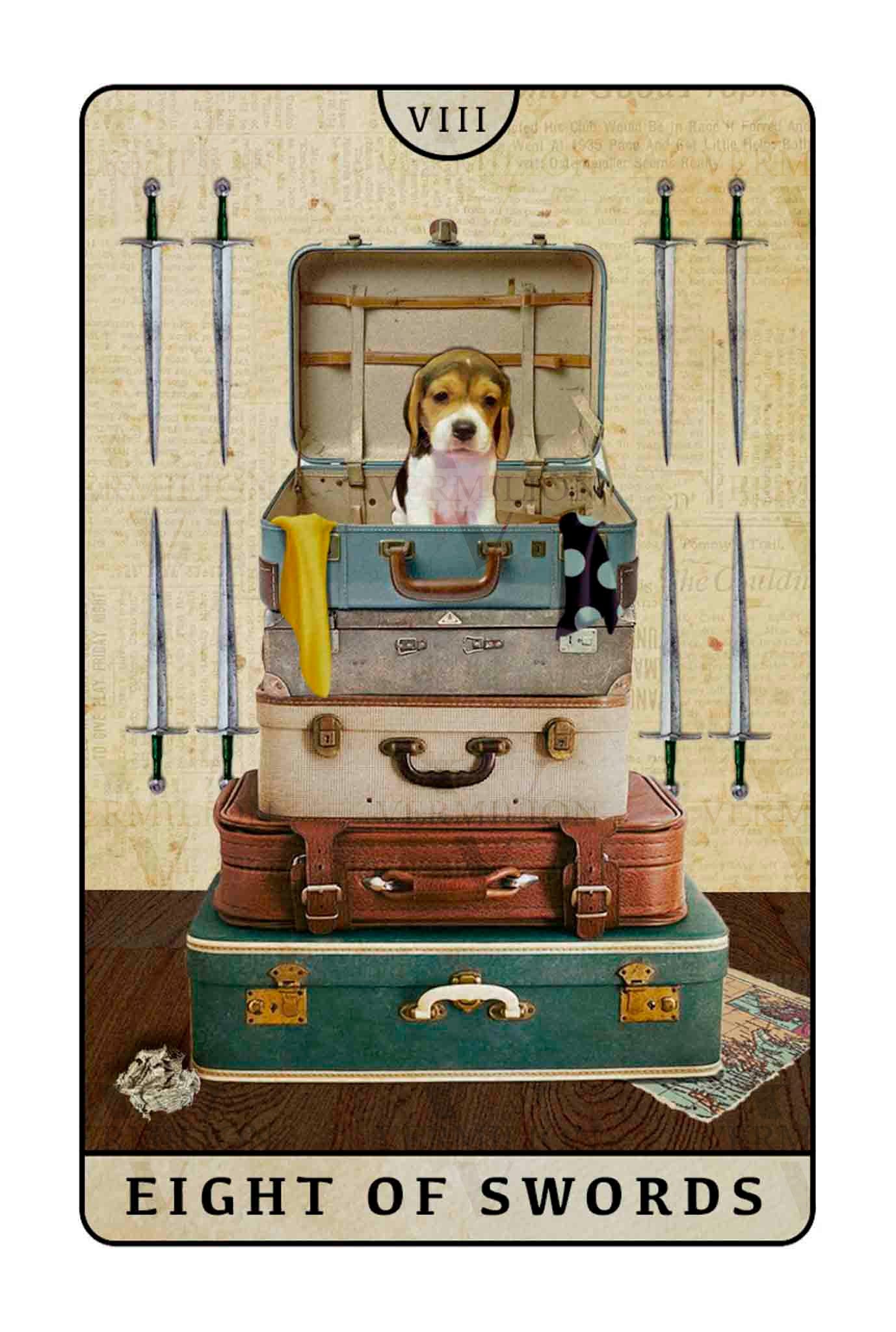 The upright Eight of Swords depicts a scene of entrapment—like the Bichon stuck inside a tall suitcase. This card suggests a feeling of being trapped, possibly due to external circumstances or internal fears and anxiety. Often, the sense of limitation comes more from our own thoughts and beliefs than from actual external restrictions. The card encourages you to confront inner fear and uncertainty, recognize your own strength, and find a way to free yourself from constraints.