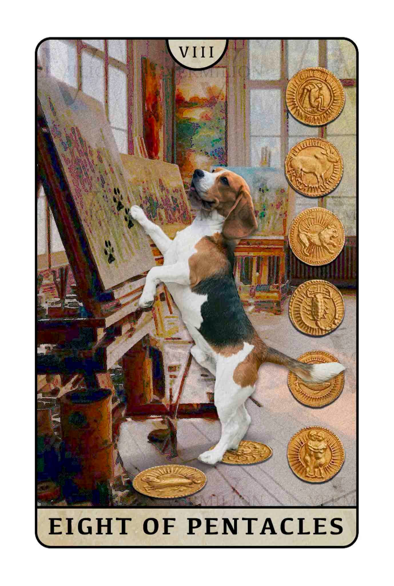 The little Bichon artist is carefully painting a piece to gift to the ninja. When the Eight of Pentacles appears upright, it emphasizes focus and diligence. The upright Eight of Pentacles signifies that you are dedicating yourself to your work and improving your skills. It suggests that through continuous learning and practice, your abilities will reach a higher level.