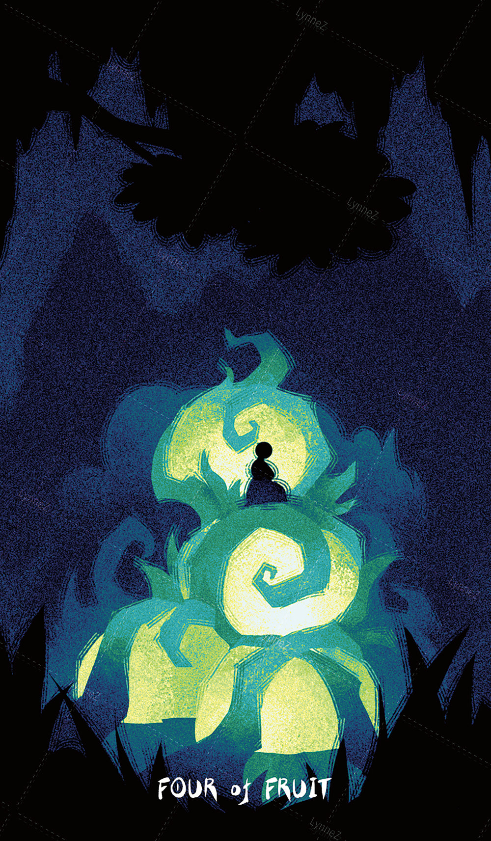 Four of Fruit Four radiant fruits are bound by massive vines, firmly rooted in the soil. The Walker has secured these resources, but in doing so, is unable to leave this area.