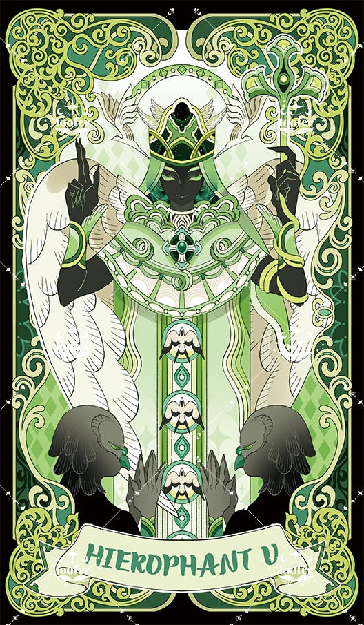 Using the image of birds, the contrast between the wings and the body is strengthened. The core of this card is to create a sense of energy transmission from top to bottom. The Hierophant, with one hand pointing upward and the other hand wrapped around the staff, closes his eyes and lowers his head, as his gaze leads the energy downward. The two followers join their hands together, receiving information and energy from the higher authority.