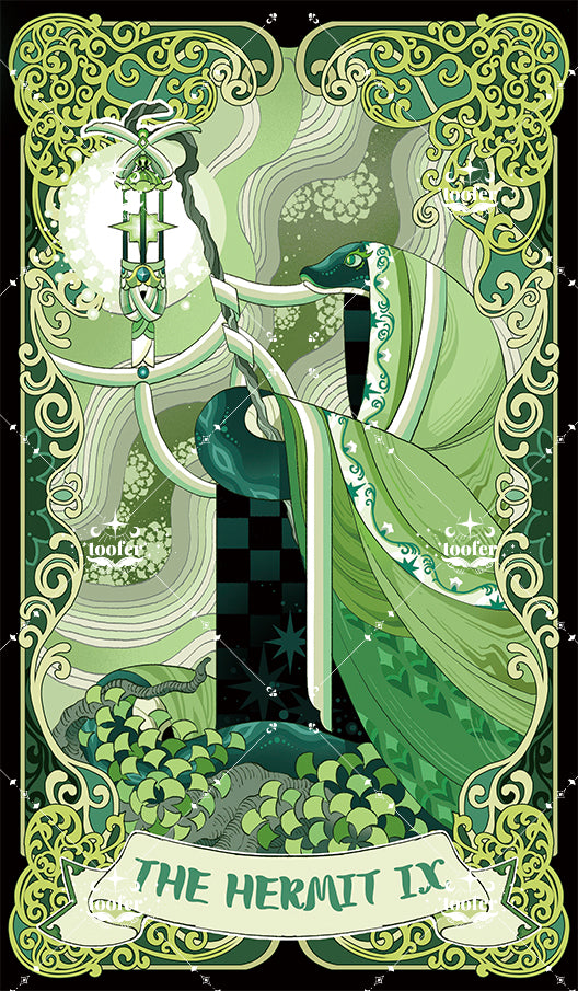 I’ve always believed that if snakes were anthropomorphized, they would become wise and mysterious hermits, dwelling alone in the deep mountains. This image perfectly aligns with the essence of The Hermit card. As such, the card features a snake-like sage dressed in a robe, holding a lantern.