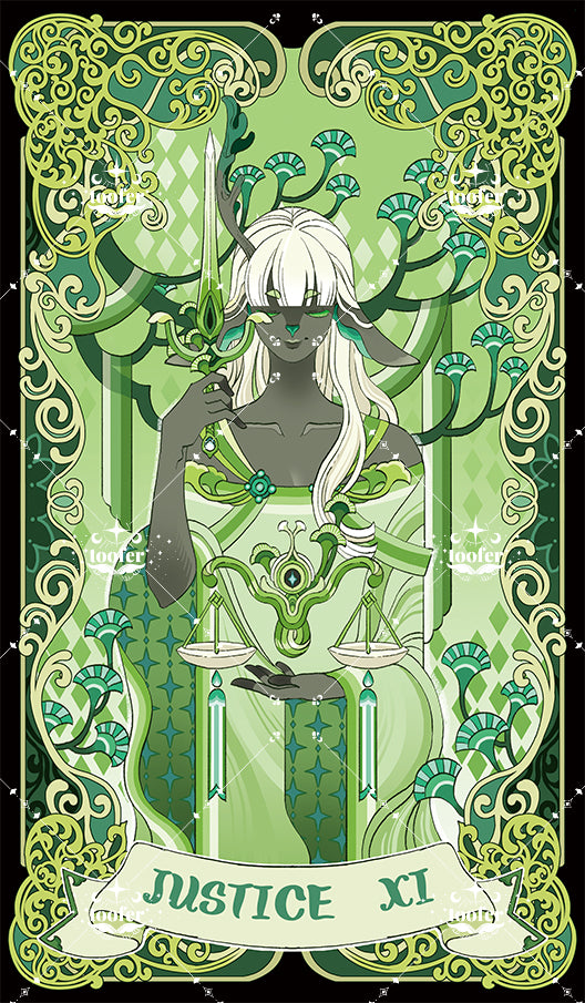 The character in this card is designed to be gentle, with closed eyes and a slight smile, implying a lack of subjectivity and blind judgment, but an absolute objectivity. One hand holds a sword, and the other hand holds a balance, indicating the ability to make judgments calmly and to administer rewards and punishments rationally.