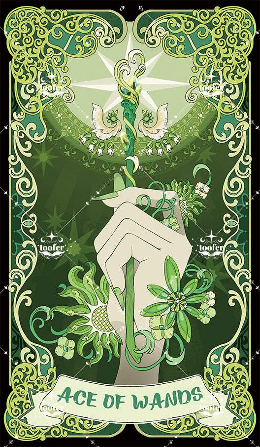 "The Hand of God" raises the wand high, aligned with the heavens, and the surrounding flowers bloom like flames. This is an attitude of readiness, with opportunities in my hands. Prepare yourself, make a firm decision, and do your best!