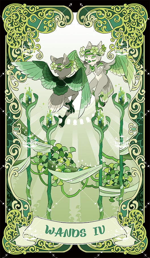 Two birds seem to be playing "house," wearing victory crowns on their heads, as if celebrating joyously. The upright wand resembles a vertically growing tree trunk, and the lush "gingko leaves" symbolize eternal love. The entire picture represents a warm and healing abode for the soul.
