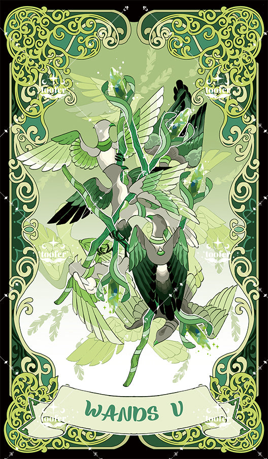 A group of birds is fighting over the five wands, creating a fierce and chaotic scene. What led to this war, and who is the true winner? The confrontational scene symbolizes the entanglement of inner desires, and misusing primal motivations often leads to an embarrassing situation.