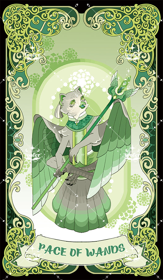 The young page is always full of curiosity and vitality. He is devoted to his duties, guarding the wand while observing and analyzing it. A pattern resembling chakras faintly appears in the background, indicating the page's wisdom and insight. He is moving towards deeper and grander goals within his heart.