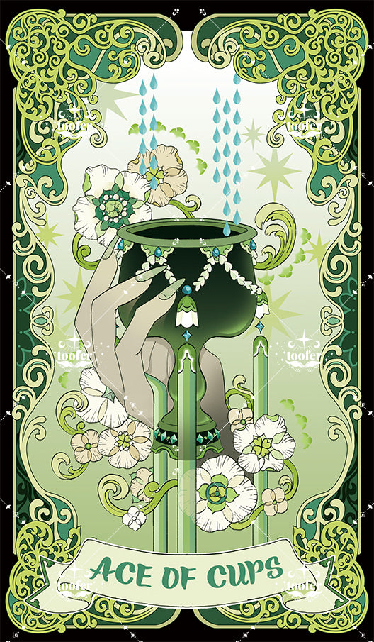 The "Hand of God" lifts the Holy Grail from the flower, and the cup flows gently and harmoniously like water, representing emotional connections and fulfillment.