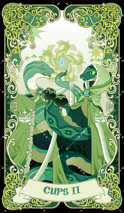 Two snakes are in an equal and interconnected state, intertwined with each other as if they are confiding in each other. They seem to be engaged in an enthusiastic conversation, making a joint decision to create something together. They complement each other, using love to create more.