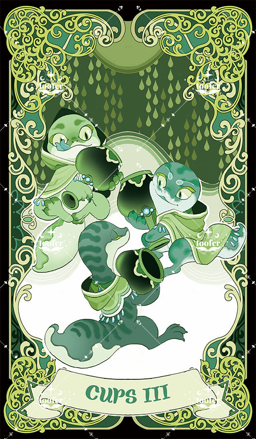Three little lizards happily sit together, holding the Holy Grail, imitating the joyous celebrations of adults at a feast. It represents the most primitive and pure friendship and happiness in human relationships.