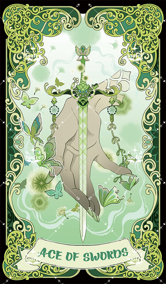 "The Hand of God" gently lifts the sword, with butterflies swirling around, seemingly showing great interest in the sword. This card represents thinking, ideas, viewpoints, and communication, marking the beginning of their manifestation.