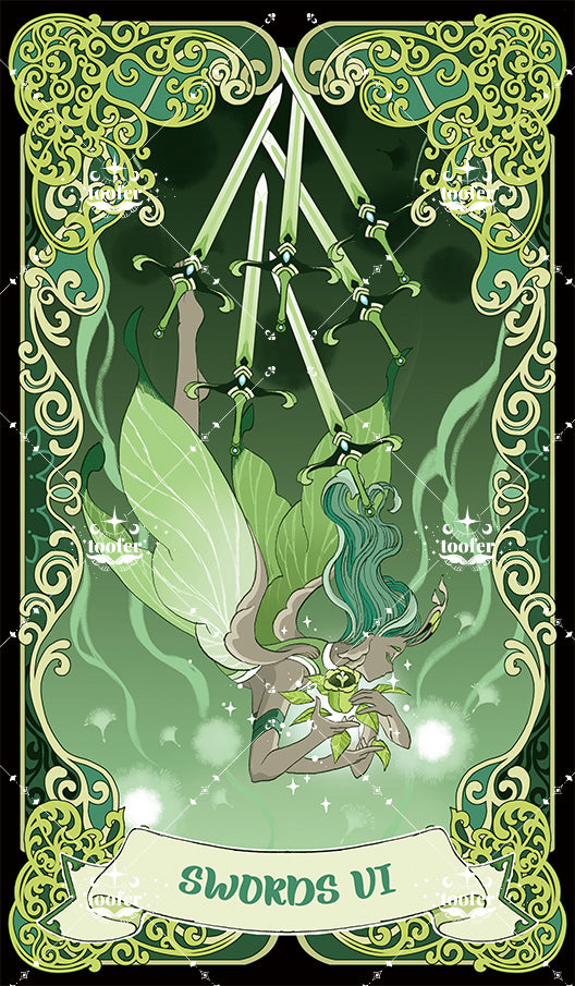 The pile of swords above symbolizes a state of chaos. Faced with the challenges happening around, the character chooses to hold windflowers and avoid looking at them. This suggests an attempt to embrace inner peace, or escape from reality, or face the challenges.