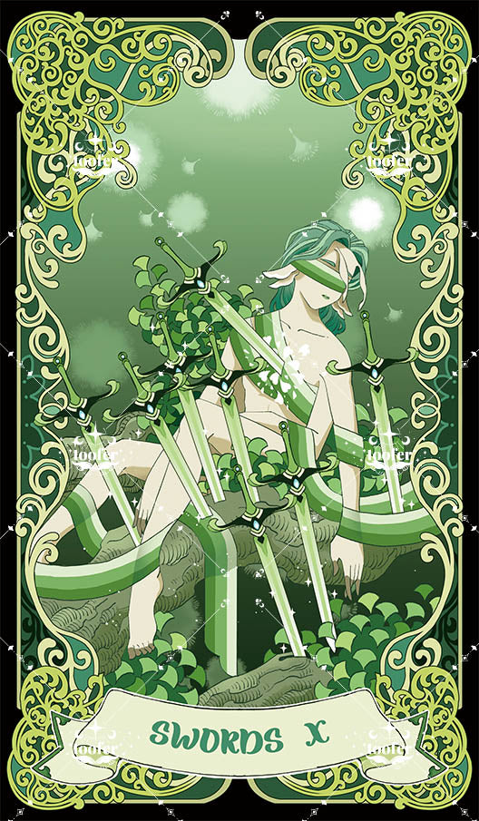 At first glance, the ten swords seem to be ending the character's life, but upon closer inspection, only one sword is positioned to be fatal. However, the character appears to be unwilling to face it, or perhaps forced not to look? The bandage on the chest seems to suggest that he was already injured, so was this fatal blow accidental?