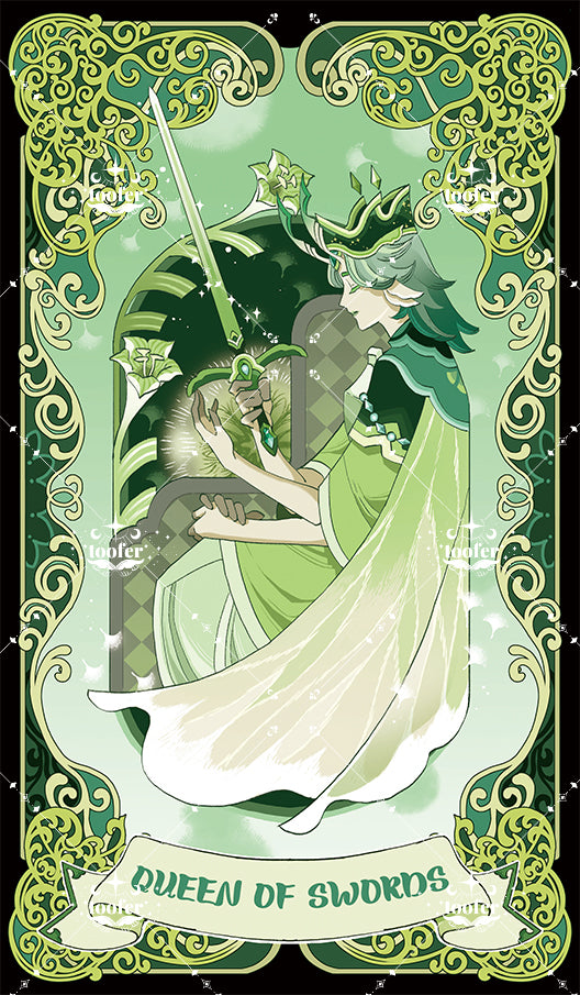 The Queen sits dignified on her throne, deep in contemplation. All her achievements come from careful and thoughtful consideration. The background with the scattered dandelions symbolizes the Queen's divergent thinking, while the lilies by the window represent her purity and loyalty. She is not one to engage in calculations, but she is willing to use her wisdom to create a better life for her people.