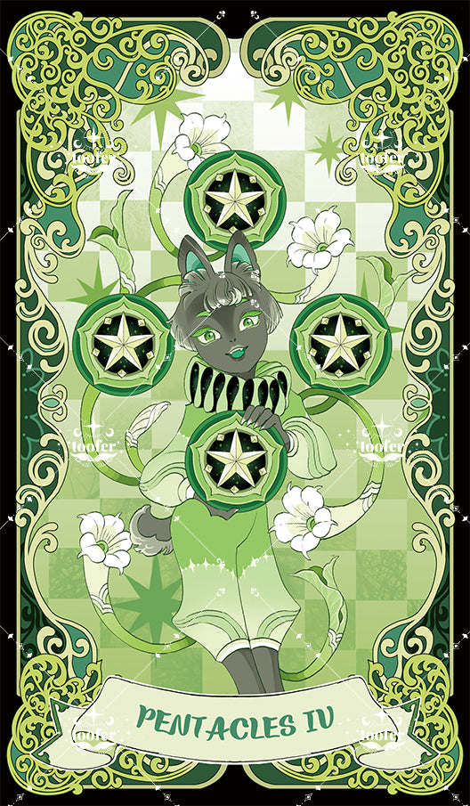 The black rabbit keeps showing off the Pentacles it possesses. For her, the Pentacles are the source of security, and the quantity of Pentacles represents success in the material world. However, she is being too attached to "seeing" the Pentacles, is she willing to let these Pentacles circulate and create more Pentacles?