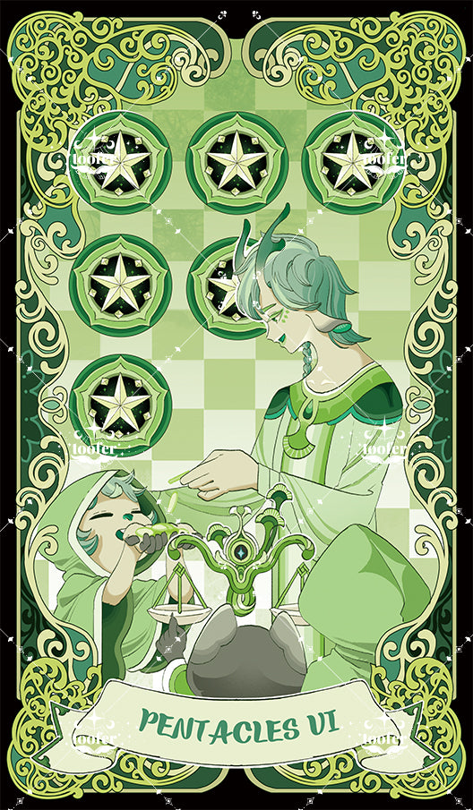 A seemingly kind young deer is giving coins to the children. The scales represent giving and receiving, but mindless giving might make the recipients fall into the inertia of dependence. The children are wearing hooded robes, indicating that they may no longer want to face their true selves and the real world, instead, they prefer to live in a false sense of satisfaction. Only a gray cat remains vigilant about this sense of dependency.