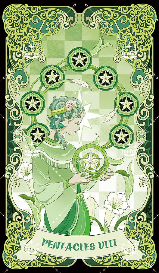 The craftsman channels the energy of the earth into the starlight through the "Morning Glory" flowers, symbolizing the process of creating pentacles. The pentacles lined up behind the craftsman represent the fruits of her continuous improvement in craftsmanship. The pentacle in her hand is still uncarved, and she will continue to focus on it and give her best effort.