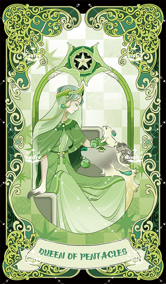The charitable and gentle queen gently strokes the goat in front of her, radiating a soft and warm light, symbolizing the brilliance of motherhood. This queen appears to possess good manners and a warm heart. The fruits in the illustration represent plants, while the rabbits and goats represent animals. This queen is the true Earth mother, presiding over the natural resources of the world to create even more abundance.