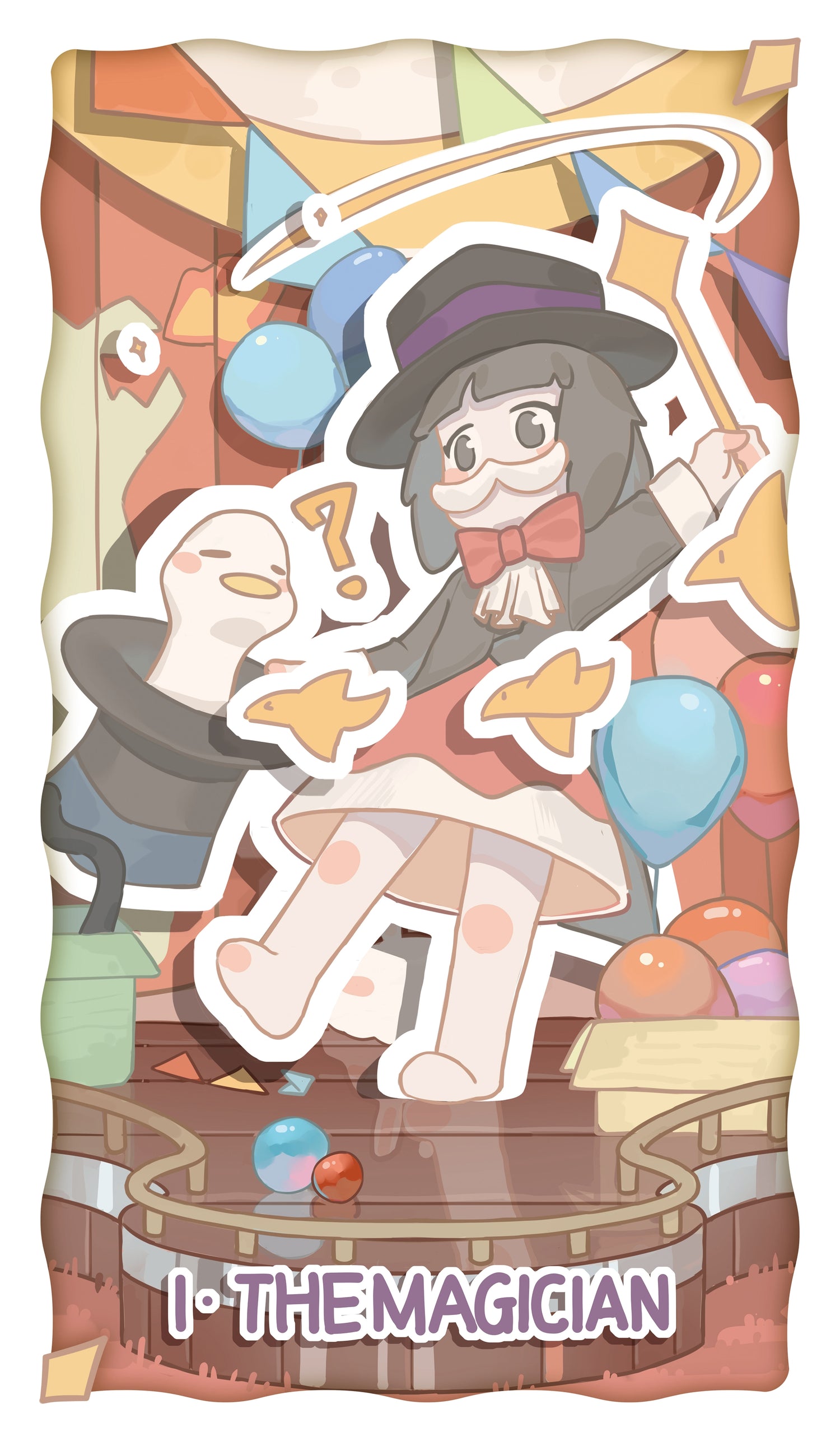 The girl wears a magician’s outfit and stands on the stage. She holds the magic wand in her left hand, pointing upward, and the hat in her right hand points downward, symbolizing a bridge between heaven and earth. The flourish of the wand seems to summon a puzzled bird from the hat, embodying creativity. A cat in a nearby box shows its lively tail, while the red and yellow color scheme conveys warmth and confidence. The long dagger at her waist represents her being fully equipped and ready for anything. The three small birds in front of her symbolize pure freedom.