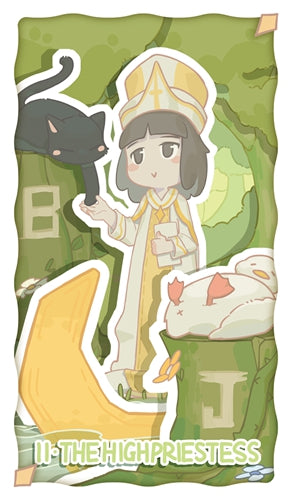 The girl stands between two stumps, each engraved with a letter—“B” and “J”—symbolizing Yin and Yang. As the High Priestess she is in the middle, indicating balance. In her left hand she cradles a book that represents wisdom and hidden knowledge. Her right hand reaches out to playfully interact with the cat perched on one of the stumps. A duck lies lazily on the stump in front of her. Below her, the reflection of the moon in the water rises and falls, sending out ripples that stand for emotions and the subconscious, suggesting she has excellent emotional regulation. The cross on her chest represents the power of nature and of the divine.