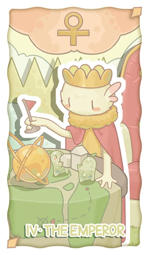 The emperor wears a crown and clothes in matching red and yellow. He holds a red flag poised to be placed, indicating forward movement, while his right hand supports him on the table. On the table before him is a game board, and a golden sphere is rotating; this golden sphere represents balance and the pursuit of order. Two little sprites cooperate to place stone figurines, looking to the emperor as if seeking his approval—this signifies the emperor’s authority and overwhelming capability. Behind him, pale yellow mountains stand neatly in rows, representing a solid backing and hinting at the need for protection.