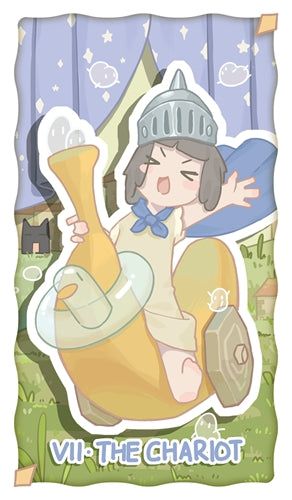 The girl wears a helmet and a blue cloak, her expression confident as she lifts her left fist high in a victory gesture. She rides a banana-shaped chariot whose wheel tilts to one side, lifting off the ground—this indicates mastery of balance, control and focus, but also calls for caution. A swim ring encircles the head of the banana chariot; the contrast between a land vehicle and a ring meant for water suggests yin–yang harmony and hints that she is bound by emotions and desires. Little sprites run and follow around her, while the cat behind looks shocked: “Wait, I’m not on board yet!” The girl has forgotten to bring the cat along—this part of the journey might feel a bit empty.